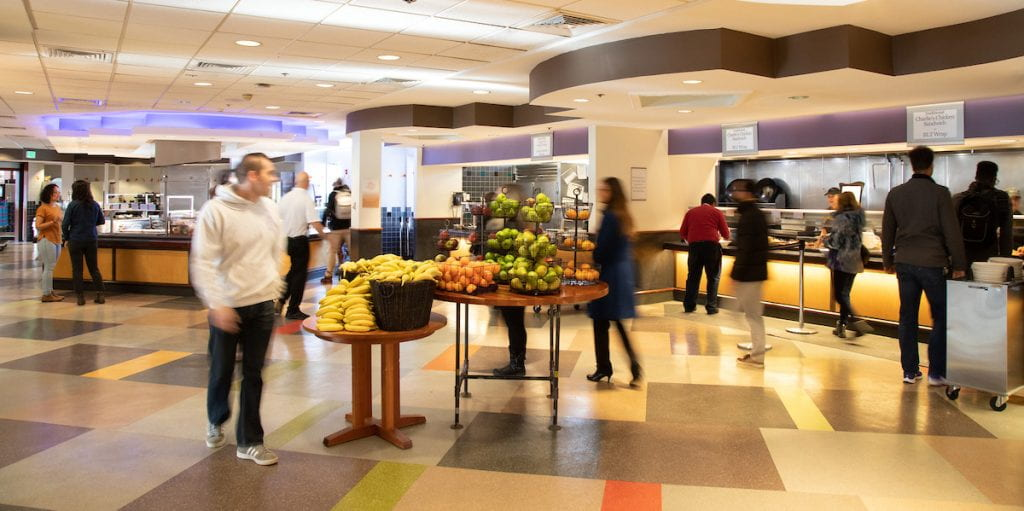 Valentine Dining Hall (Val). The only dining hall on campus. While students complain about it, it ensures you meet everyone. Students sit at long tables, eating while fiercely debating politics or philosophy.]