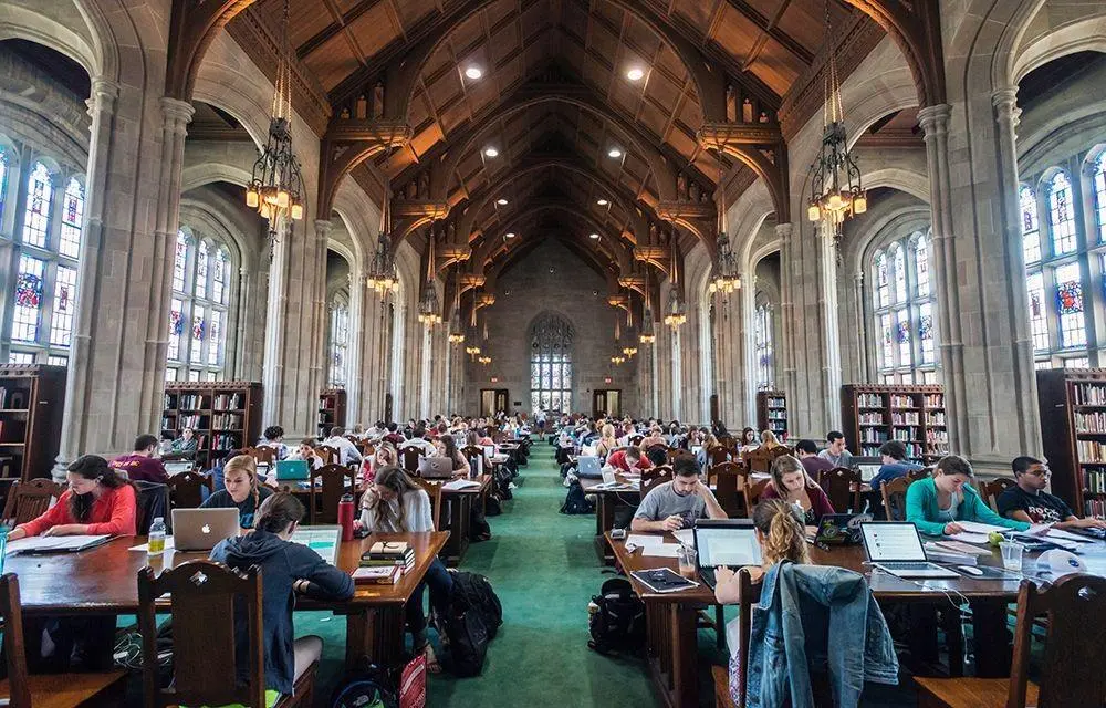 巴普斯特图书馆 (Bapst Library)。这被称为全美最像《哈利波特》的图书馆。彩色玻璃窗、长条木桌、绿色的台灯。在这里自习,你会觉得自己正在学习魔法。]