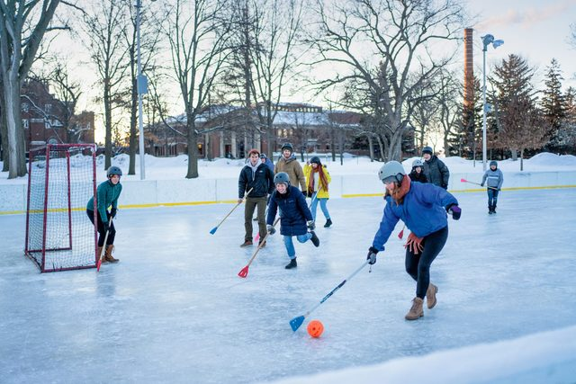 Minnesota Winter. Students playing “Broomball” on a frozen lake, a classic Carleton winter tradition.]