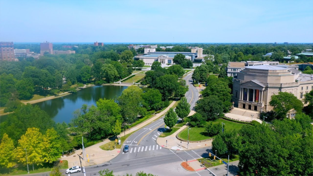 University Circle. A miraculous cultural island. The campus is surrounded by the Cleveland Museum of Art, the Severance Hall (Orchestra), and Botanical Gardens. While Cleveland is gritty, this square mile is a cultural paradise.]