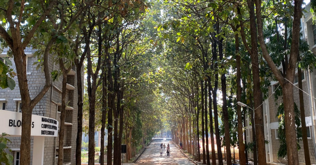![图片: 校园林荫道。两旁是参天大树。UPM的绿化覆盖率高达70%以上。]